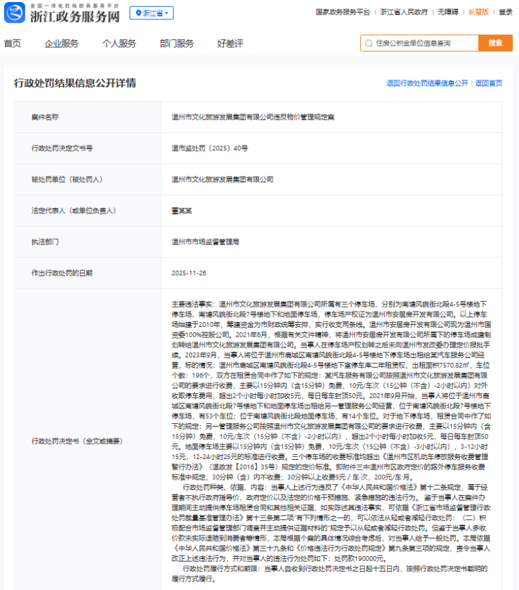 海报新闻记者钟浩然近日报道,温州市市场监管局决定对温州文旅发展集团有限公司(以下简称“温州文旅集团”)给予行政处罚。该公司因旗下3个停车场未履行必要的价格审批手续,收取超出政府指导价的费用,被依法罚款19万元。经查,涉案三个停车场分别为南塘枫梦街北侧4、5号楼地下停车场和7号楼地下、地上停车场,原为温州安居房发展有限公司所有资产(由市国资委100%管理)。该项目于2010年在市财政资金紧张的情况下建成,实行收入和支出双重管理。六月2021年,根据相关文件要求,该停车场划转给温州文旅集团,但后者尚未向温州市发改委办理价格审批手续。集团将分别于2021年9月及2023年9月起将上述停车场出租予两家服务公司,收费标准将在租赁协议中订明。 4号楼、5号楼地下停车场(196个车位)和7号楼地下停车场(53个车位)“前15分钟免费,15分钟至2小时10元,除此之外每小时加收5元,一日使用”。上限为50元。e大厦地上停车位(14个车位)前15分钟免费。15分钟至3小时10元,3小时至12小时15元,12小时至24小时25元。以上价格标准均超过g《温州市城市停车服务暂行收费管理办法》(温政发[2016]35号)规定的政府指导价为“30分钟以内免费,3小时以上每趟5元”。 30分钟,每月200元。”温州市市场监管局指出,温州文旅集团的行为违反了《中华人民共和国价格法》第十二条,构成“未执行政府指导价”的违法行为。最终根据《中华人民共和国价格法》第三十九条和《价格违法行为行政处罚条例》第九条第三款的规定,对该消费者进行一般罚款,并责令该公司自收到行政处罚决定书之日起15日内改正违法行为,并处罚款19万元。建立于2020年7月1日落户,是温州现代服务业发展集团旗下国有控股公司,注册资本10亿元。集团主体由温州现代服务业发展集团旗下明城资产公司、华侨饭店、天都酒店、现代旅游投资公司、电影公司、燕帆影业等六家子公司整合而成。